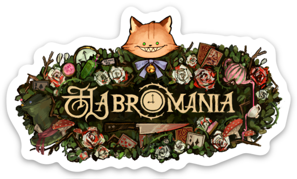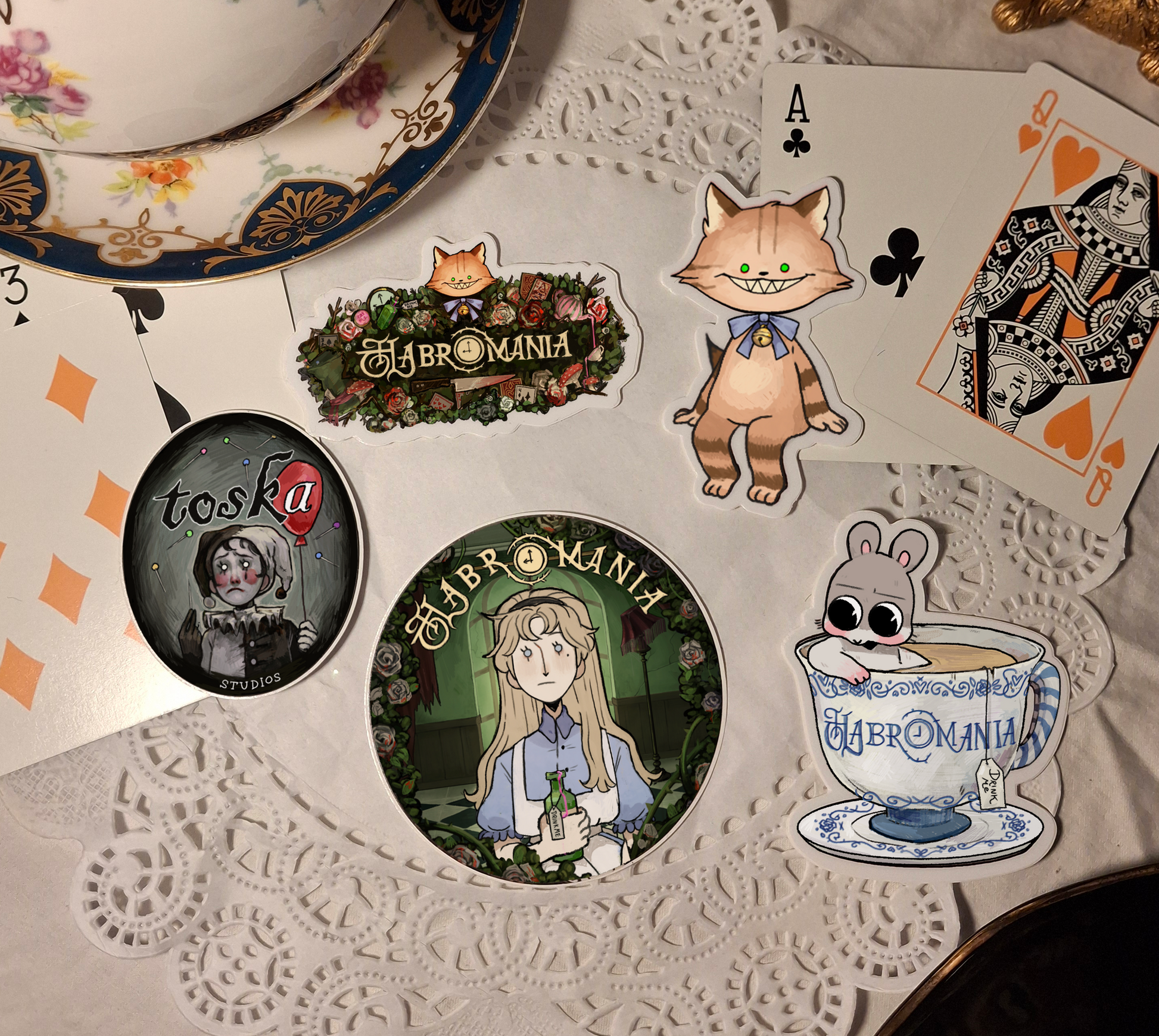 a 5-sticker bundle of all the HABROMANIA stickers, including the logo, Alice, the dormouse in his lil teacup, the cat, and the Toska Studios logo. For the dedicated sticker/HABROMANIA fan!
